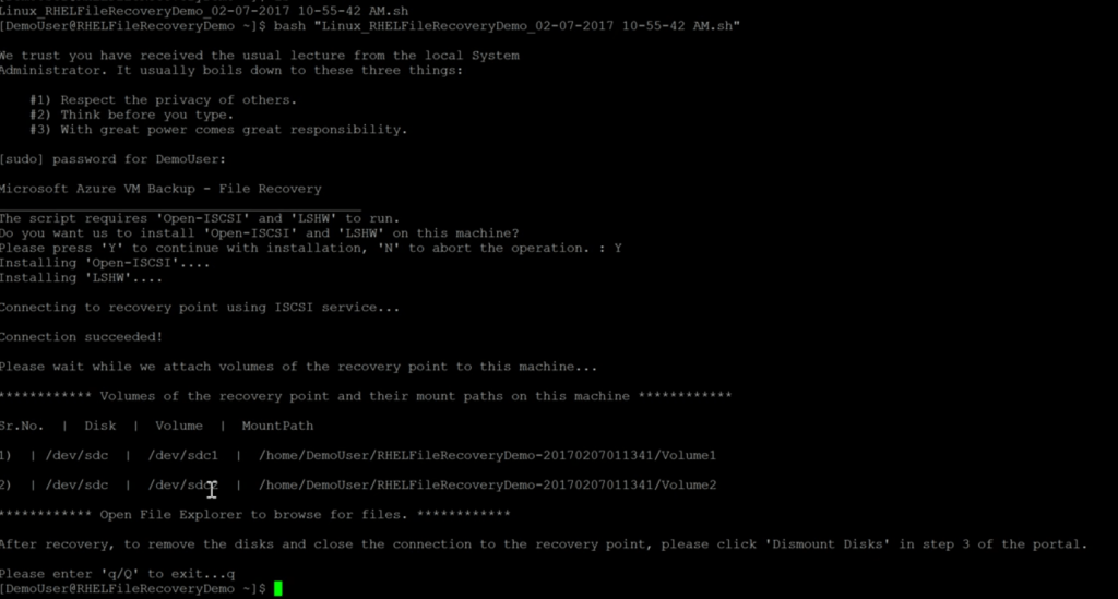 Execute the script using bash <filename.sh>. First time the VM adds support for the iSCSI service which is required for mounting the back-upset. Choose Y for installation the iSCSI drivers and wait a few seconds. You see that entire back-upset is mounted. Now you can copy all the necessary files you need.