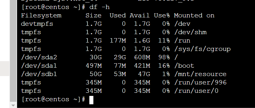 Notice my 30GB root filesystem (/) which is nearly full and the additional 50 GB disk which we’re going to add to the root volume.